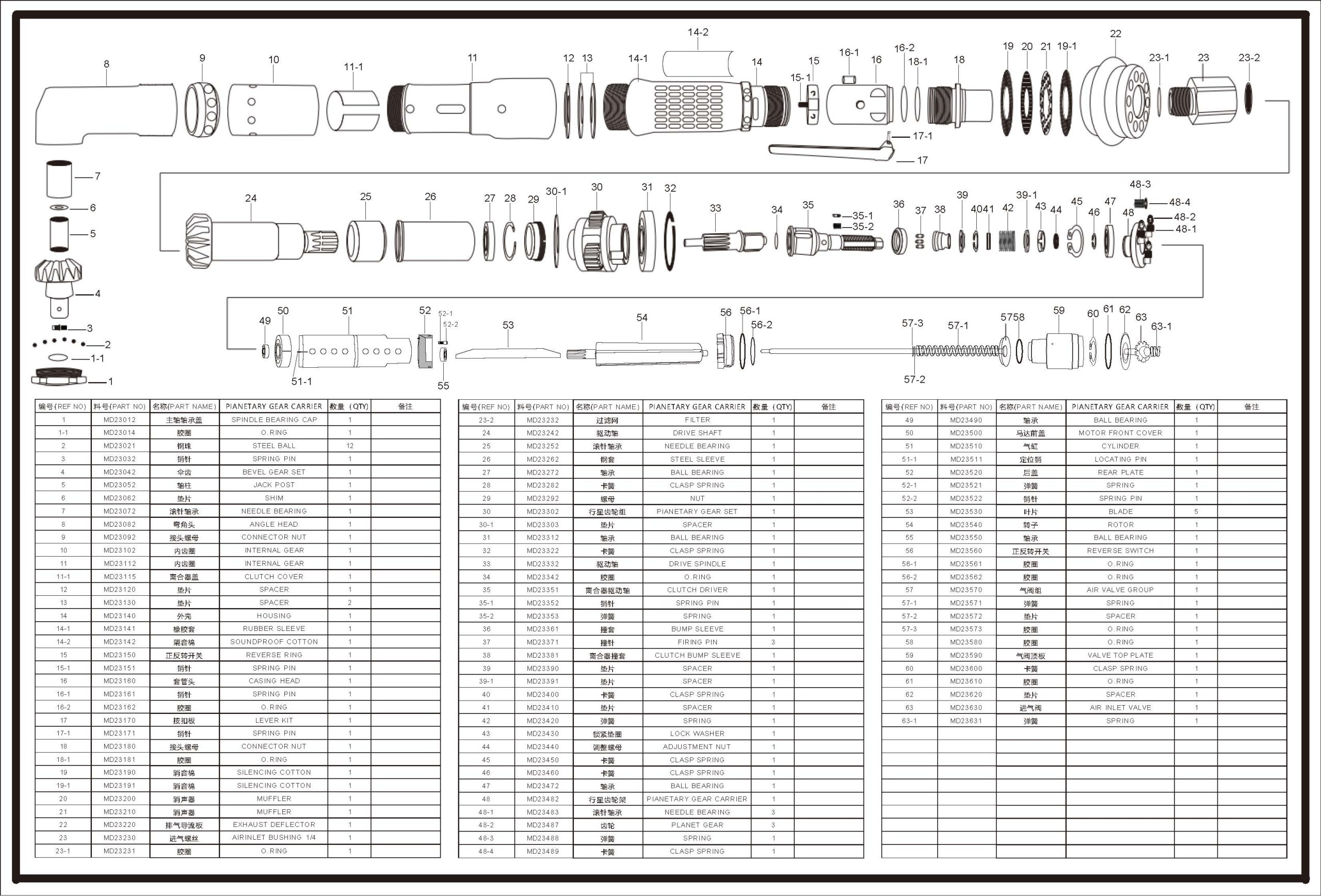 | No. | Model | Torque | Square drive | Free speed (rp.m) | Bolt size | Model type | Air consumption | Sound pressure | Working Pressure | Recommended hose size | Air inlet thread | Angle head height | Length | Weight |