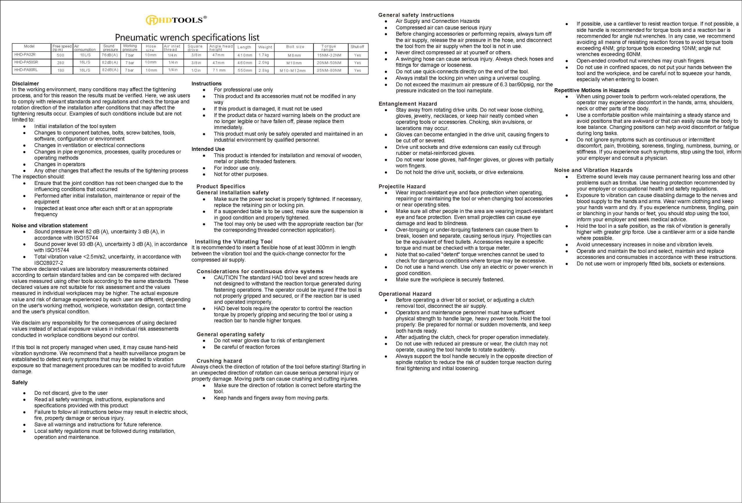 | 2 | HHD-PA50SR | 20-50N.m | 3/8 inch | 280 | M10 mm | Angle | 16 L/S | 82dB(A) | 7bar | 10mm | 1/4 inch | 47mm | 460mm | 2.0kg |