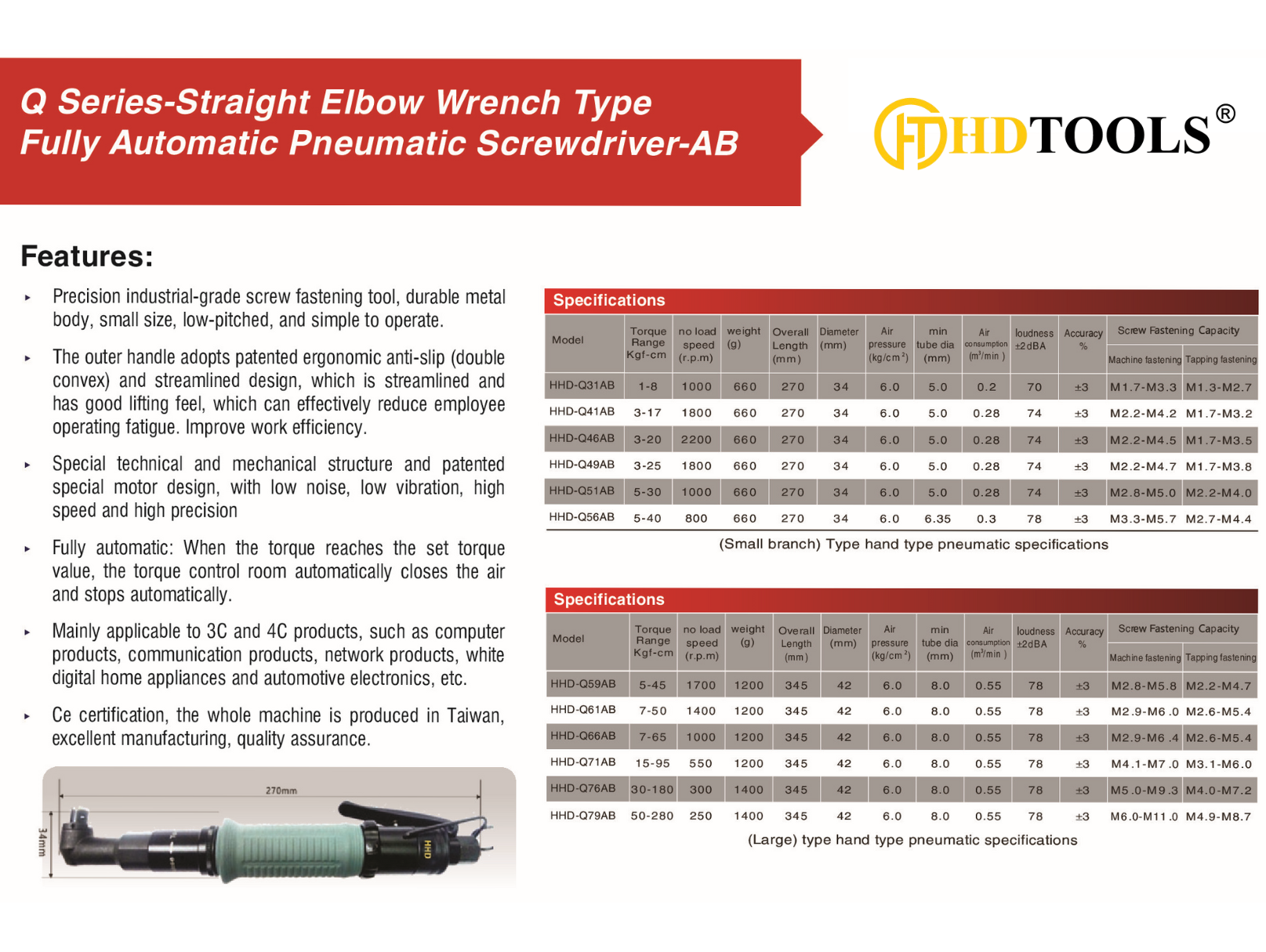 Q Series-Straight Elbow Wrench Type Fully Automatic Pneumatic Screwdriver-AB HHD-Q31AB / HHD-Q41AB / HHD-Q46AB / HHD-Q49AB / HHD-Q51AB / HHD-Q56AB / HHD-Q59AB / HHD-Q61AB / HHD-Q66AB / HHD-Q71AB / HHD-Q76AB / HHD-Q79AB