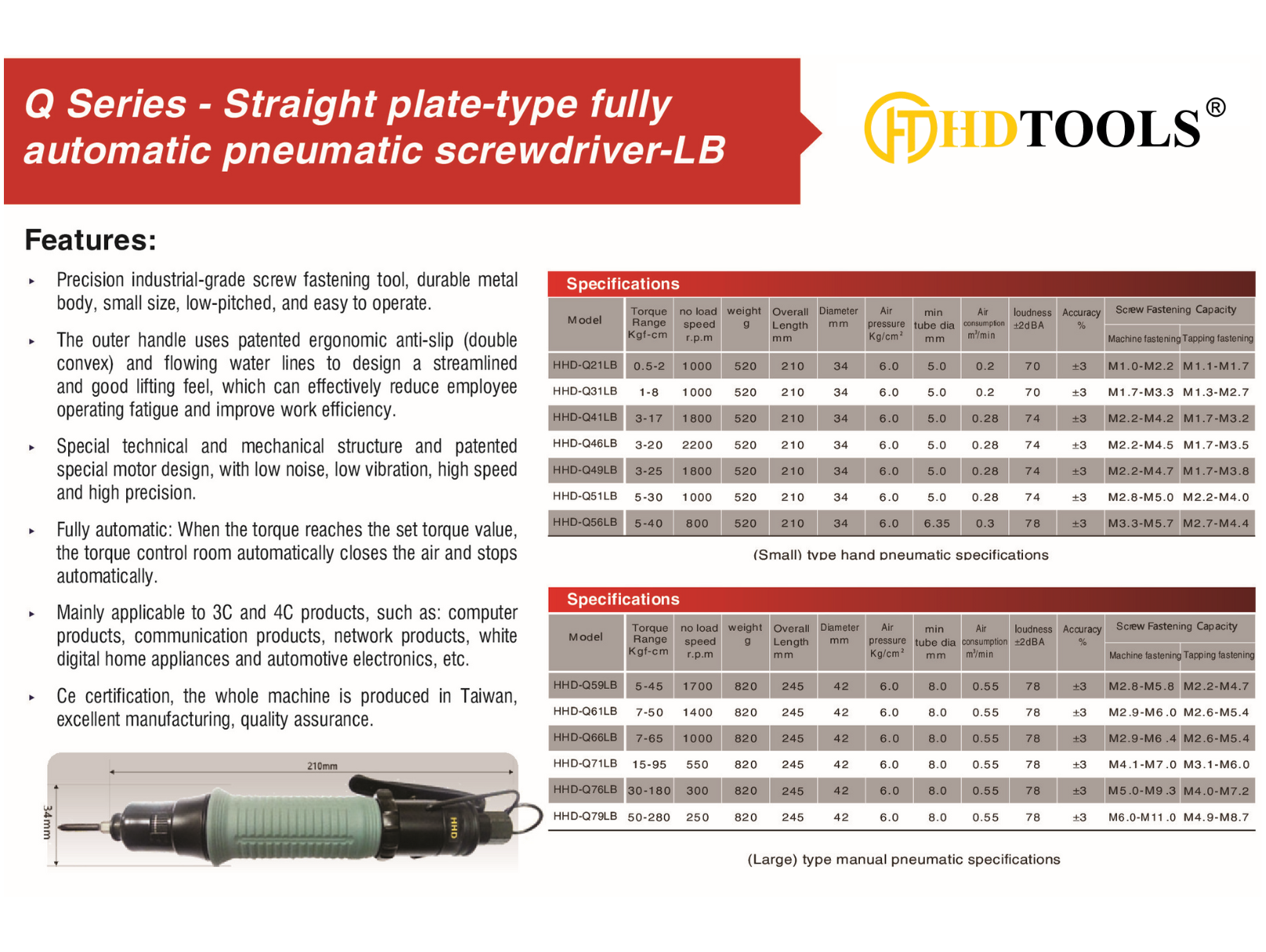 Q Series – Straight plate-type fully automatic pneumatic screwdriver-LB HHD-Q21LB / HHD-Q31LB / HHD-Q41LB / HHD-Q46LB / HHD-Q49LB / HHD-Q51LB / HHD-Q56LB / HHD-Q59LB / HHD-Q61LB / HHD-Q66LB / HHD-Q71LB / HHD-Q76LB / HHD-Q79LB