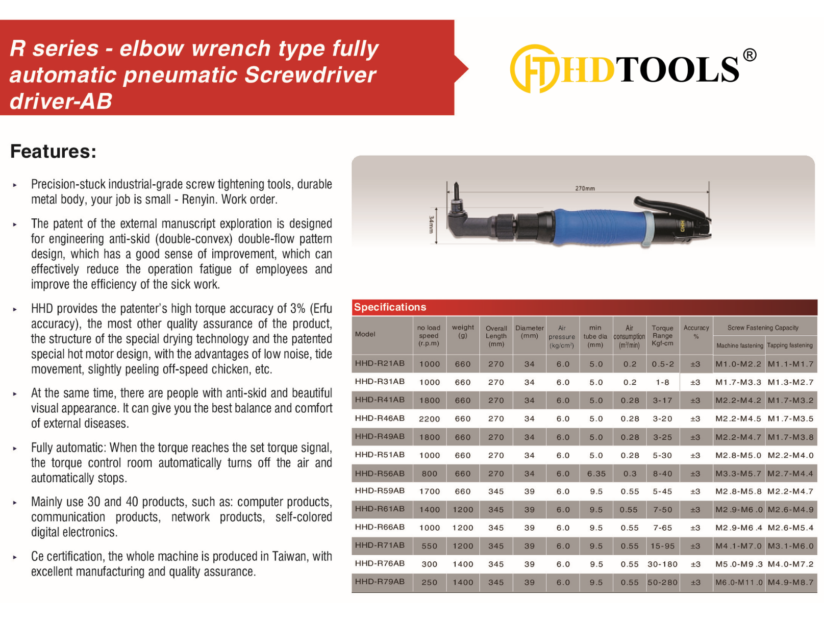 R series – elbow wrench type fully automatic pneumatic Screwdriver driver-AB HHD-R21AB / HHD-R31AB / HHD-R41AB / HHD-R46AB / HHD-R49AB / HHD-R51AB / HHD-R56AB / HHD-R59AB / HHD-R61AB / HHD-R66AB / HHD-R71AB / HHD-R76AB / HHD-R79AB