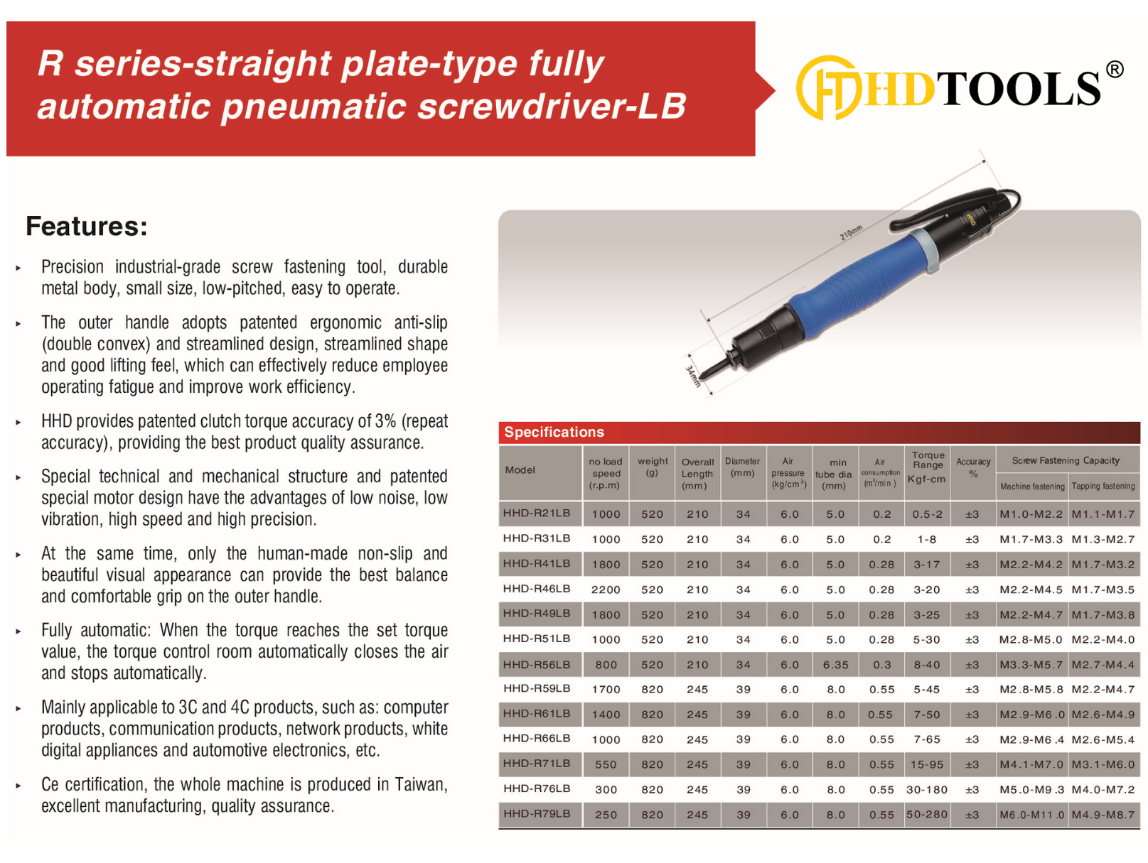 R series-straight plate-type fully automatic pneumatic screwdriver-LB HHD-R21LB / HHD-R31LB / HHD-R41LB / HHD-R46LB / HHD-R49LB / HHD-R51LB / HHD-R56LB / HHD-R59LB / HHD-R61LB / HHD-R66LB / HHD-R71LB / HHD-R76LB / HHD-R79LB
